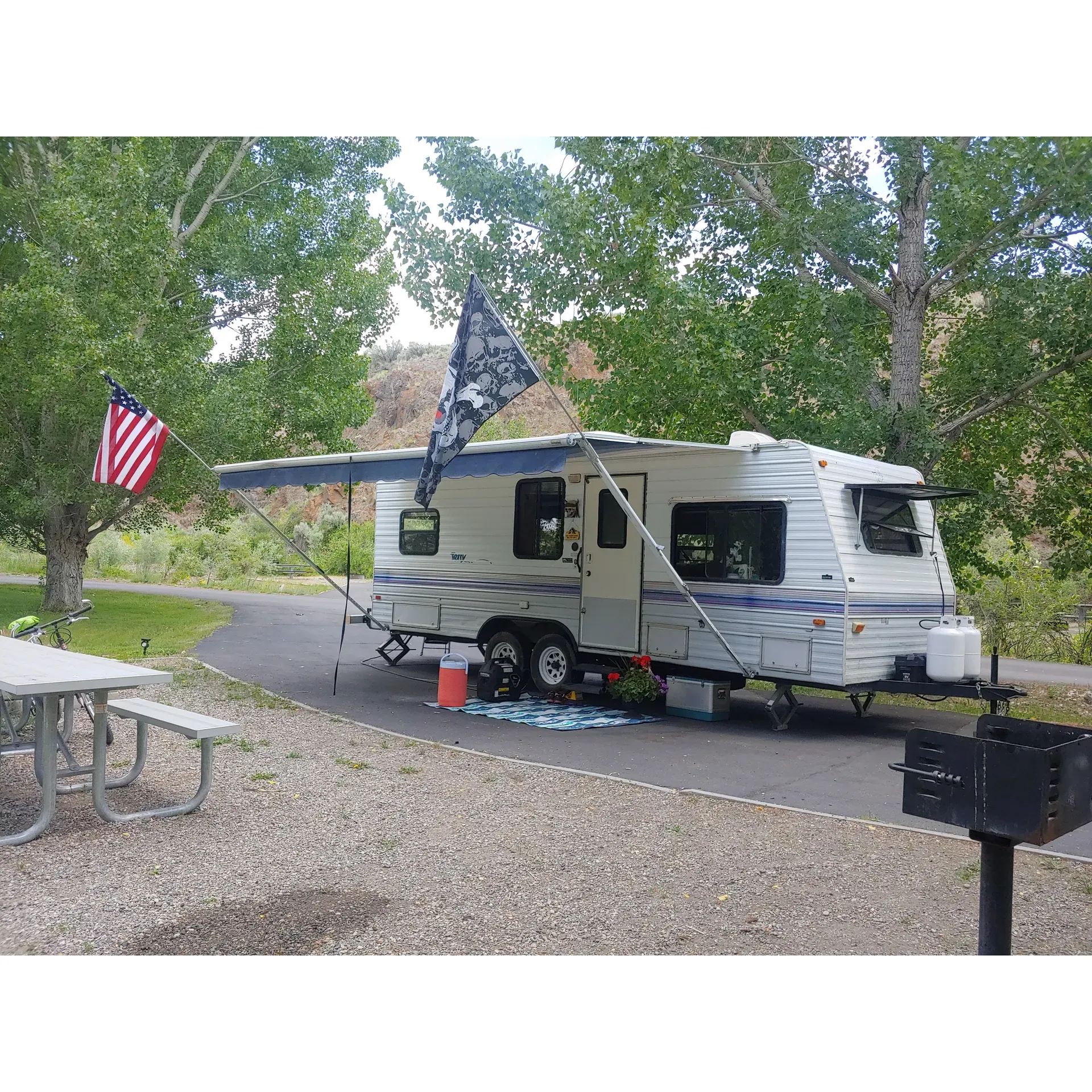 Cleanliness is a priority at this welcoming site, as evidenced by the well-maintained restrooms and sufficient trash receptacles scattered throughout the grounds. Revel in the picturesque setting embellished with beautiful cottonwood trees, creating a scenic backdrop for your camping experience.