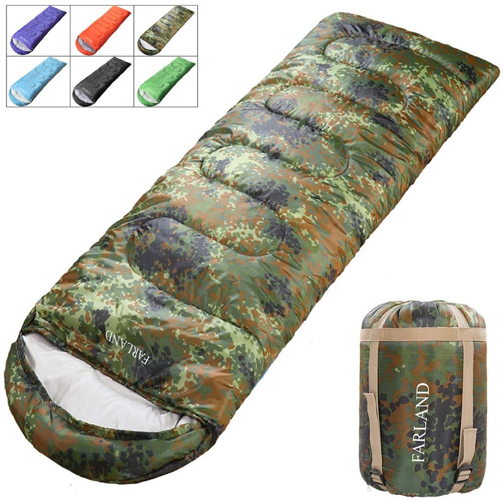 About Farland Sleeping BagOur Farland Always Insist on Supplying Super Comfortable warm Sleeping Bags at an affordable price.It has 100 polyester lining which is skin-friendly and uses high quality 290T Nylon on the outer cover to offer durability to the sleeping bag. It is the best choice for you to use it in Traveling, Camping, Hiking, and Outdoor Activities. FeaturesStorage Pocket: Secure internal pouch for valuables (phones, keys)Joint left-zip right-zip togerher: Double zipper system with windproof lining for extra insulation.Easy to clean: Farland sleeping bags are safer for machine wash.Lightweight Portable : weighing is around 4.0 pounds and compressing down to 8x 8x 15inches, this bag is perfect for winter backpacking and camping. 100 RISK-FREE SATISFACTION GUARANTEEIf you are not satisfied with the Farland Sleeping Bag, just return it within 30 days for a full refund. LIMITED TIME PRICING: Buy now to take advantage of the limited-time special pricing!. Sleep comfortably, even when it's 20 F outside, in the FARLAND Sleeping Bag with a zipper weather-stripping design. It's designed to keep you warm from top to bottom. The drawstring-adjustable and hood surrounds your head to keep you warm. When you're done, it's easy to put it away in the stuff sack.The Sleeping Bag fits heights up to 6 ft. 10 in. and is machine washable.. About FARLAND. FARLAND is a manufacturer brand which specialize in outdoor products(like sleeping bag, hammock, patio umbrella, yoga mat,tent,camping pillow and other outdoor products), adhere to the concept of being usercentered and productcored, is committed to providing users with a relaxed, enjoyable, comfortable quality life. The slogan of our FARLAND is to enrich your outdoor experienece. Since its inception, it has maintained a highspeed and stable development. Products are widely sold in the United States, Europe, Japan and other most specific countries and regions and received the users good feedback.