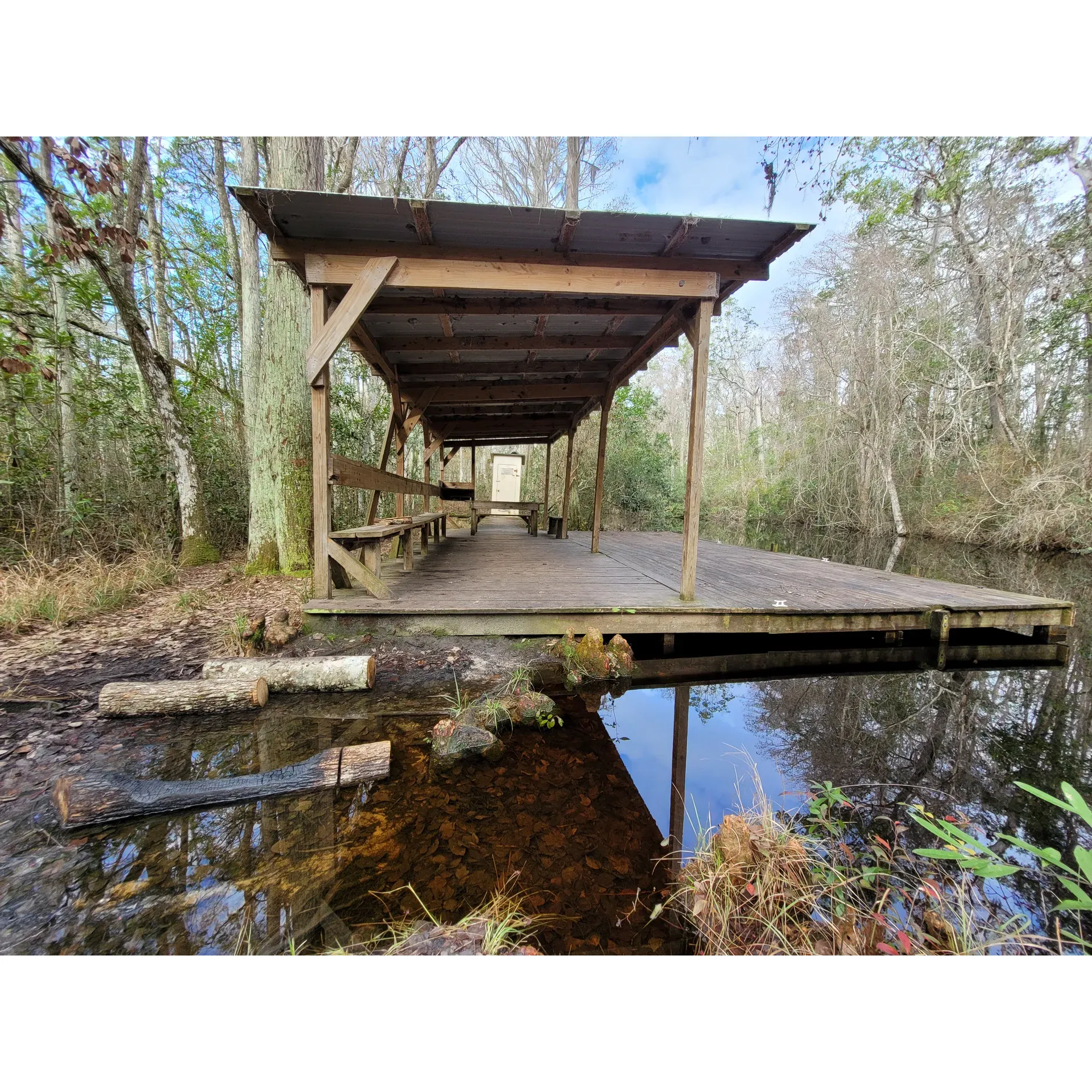 Upon arrival from the more favorable eastern approach through the swamp, guests are greeted with a well-maintained site that boasts a spacious platform shelter complete with a long bench that invites weary paddlers to relax and soak in the scenic views of the canal’s narrower stretches. This picturesque enclave is replete with an array of lush trees that offer both shade and a scenic backdrop to the gentle waters nearby.
