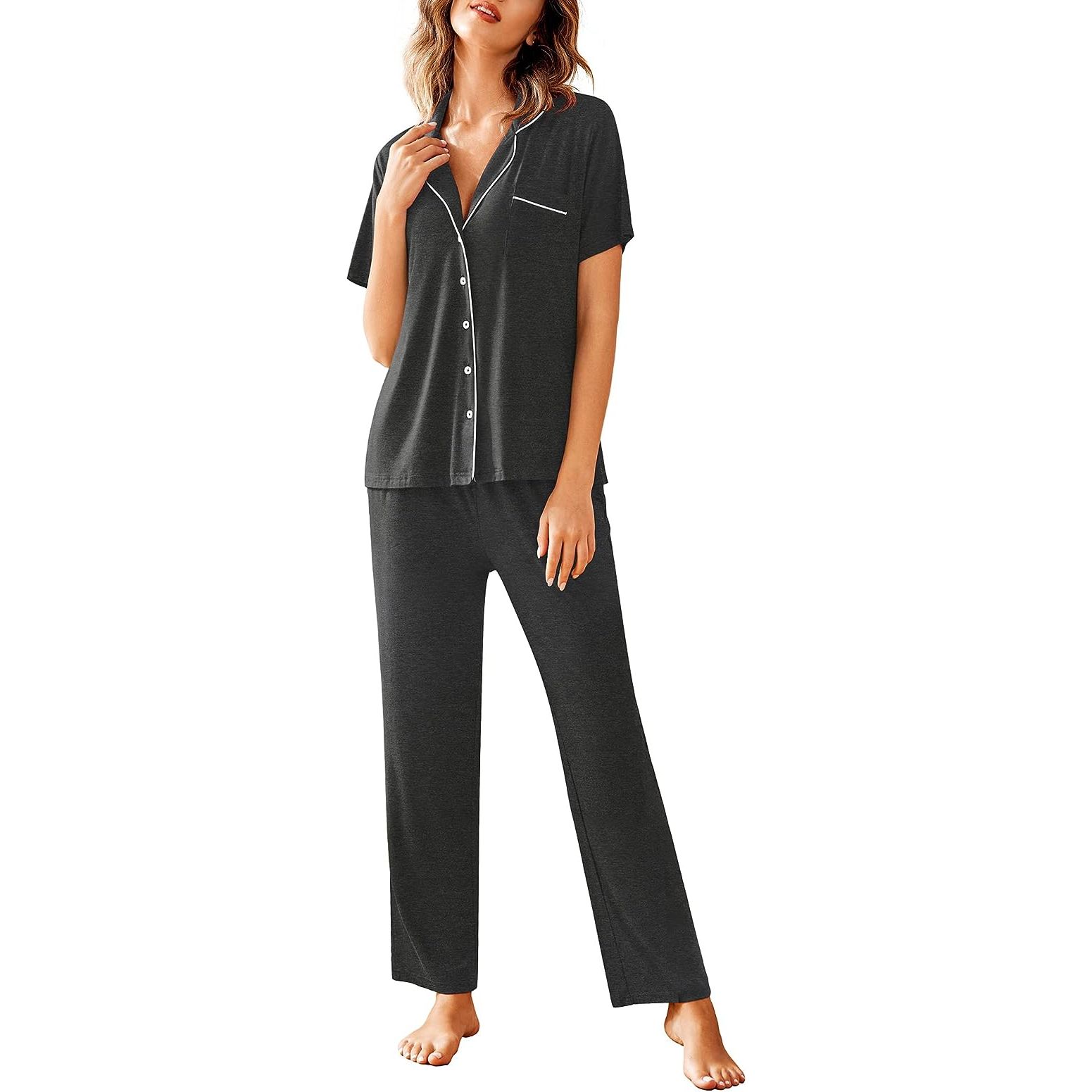 This two-piece sleepwear ensemble features a short-sleeved boyfriend top and long bottoms, meticulously crafted with comfort at the forefront of our design. Our attention to detail and reliable stitching guarantee a high-quality product that will enhance your overall quality of life. The pajama top boasts a button-down closure, notched collar, matching chest pockets, and elegant contrast piping, creating an exquisite and sophisticated look.