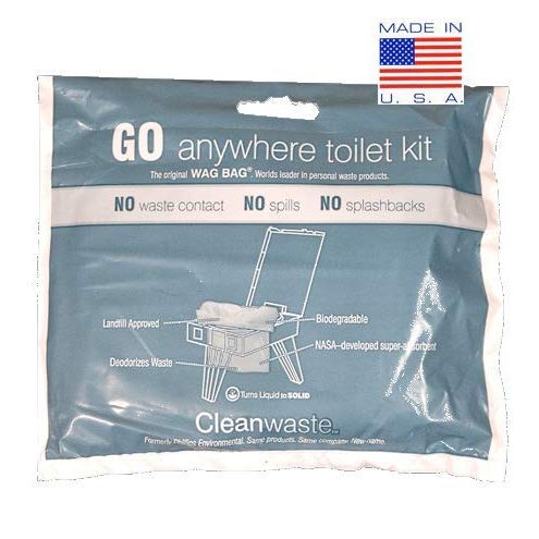 12 Pack - GO Anywhere Lightweight Portable Toilet Kit REFILLS for Camping, Hiking, and Backpacking with Three Toilet Waste Kits (Waste Bag with Poo Powder, Zip-Close Storage Bag, Toilet Paper and Lemon Scented Moist Towelette).Enjoy dignified convenience with when you use our safe, sturdy, thoughtfully engineered, premium quality GO Anywhere Portable Toilet (PETT) from Cleanwaste Company. This Toilet Kit is designed to be used in conjunction with the GO Anywhere Portable Toilet, however it can also be used with other toilet systems as well. Each of the 12 kits comes complete with a waste bag, Poo Powder gelling and deodorizing agent, secure puncture resistant zip-close disposable bag, toilet paper, and Lemon Scented Towelette. This Toilet Kit helps prevent the spread of disease by preventing spills, splashbacks, and waste contact. Each Toilet Kit gels up to 32 oz. (40 more than competing products) making it a multiple use bag and lowering the cost per use. The GO Anywhere Toilet Kit is the ONLY solution that traps, encapsulates, deodorizes and breaks down waste with a NASA-developed gelling agent. Use it, seal it and toss it in normal trash. Each biodegradable kit contains 1 multi-use waste bag, zip-close puncture-resistant storage bag, toilet paper and a moist towelette. Disposal bags contain environmentally friendly Poo Powder that quickly turns human waste into a solid for easy transport and safe disposalEach waste bag contains odor neutralizers that gel up to 32 oz. of liquids and solids making it a multiple use bag.Environmentally friendly, landfill-approved GO Anywhere waste bags can be disposed of in trash with regular garbage.Permitted by the U.S. Bureau of Land Management for use on rivers and in Wilderness Areas where toilets are required.Cleanwaste GO Anywhere Toilet waste bags are recommended by the Leave No Trace program in conjunction with the National Forest Service. Made in the USA.