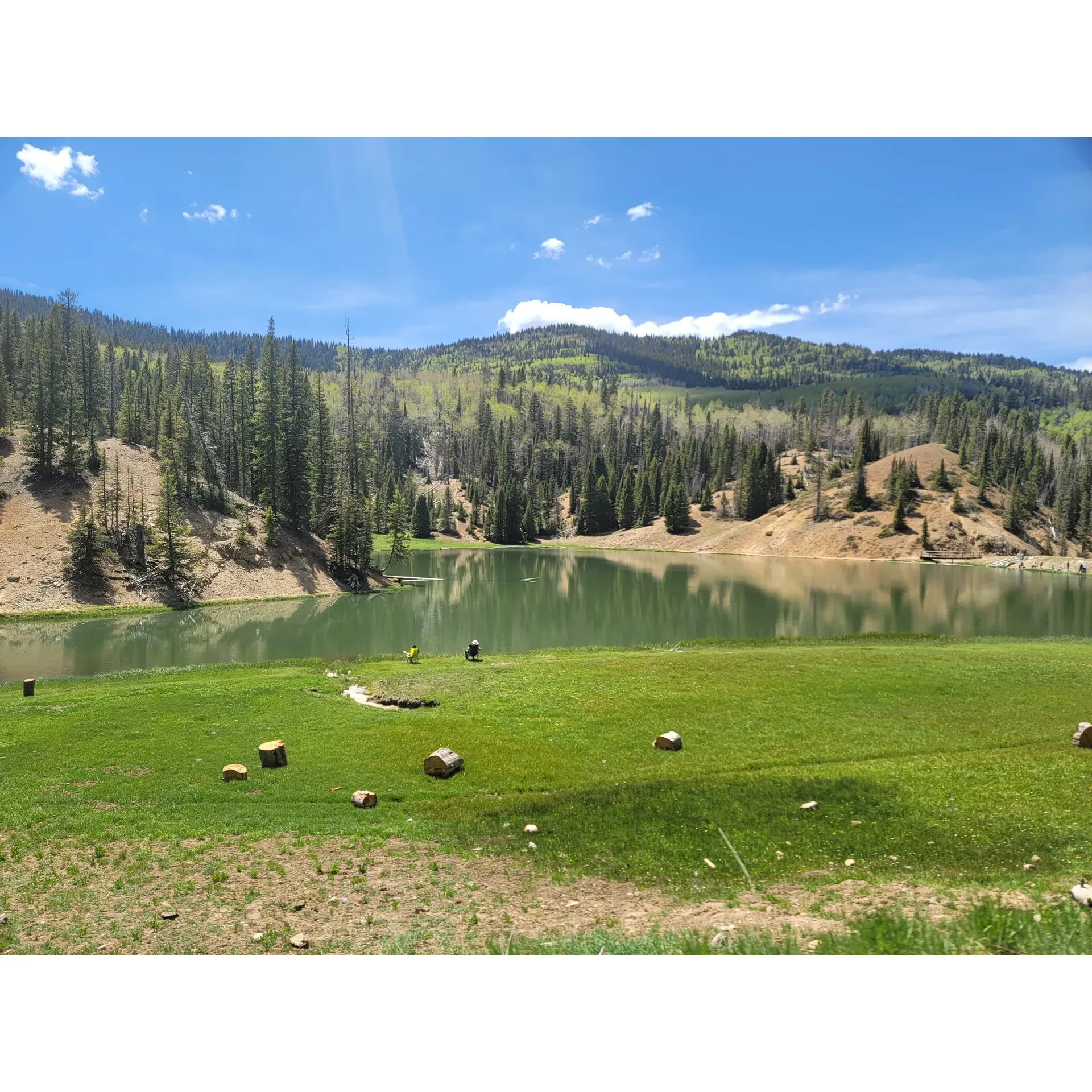Serene mornings at the campground are an invitation to witness the majestic dance of fish leaping in the tranquil lake, bordered by the dramatic backdrop of pine-draped cliffs. This idyllic scene is made more enchanting with local wildlife, including elks and deer, gracefully traversing the mountain roads. Anglers, kayakers, and those seeking solace on the water will find themselves at home on the beautiful small lake, where the fish are plenty and the sense of peace is abundant.